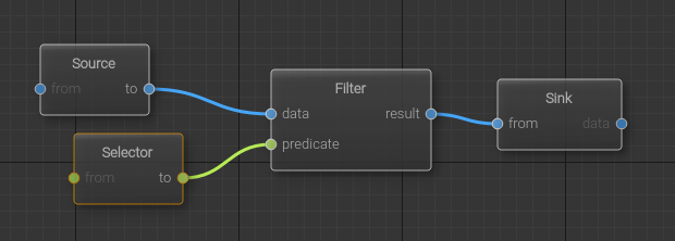 These two sources are linked to the input of a Ra::Dataflow::Core::Functionals::FilterNode, here represented by the Filter< ... > node. This node select from its in input only the values validated by the predicate f and built its output out with these values.