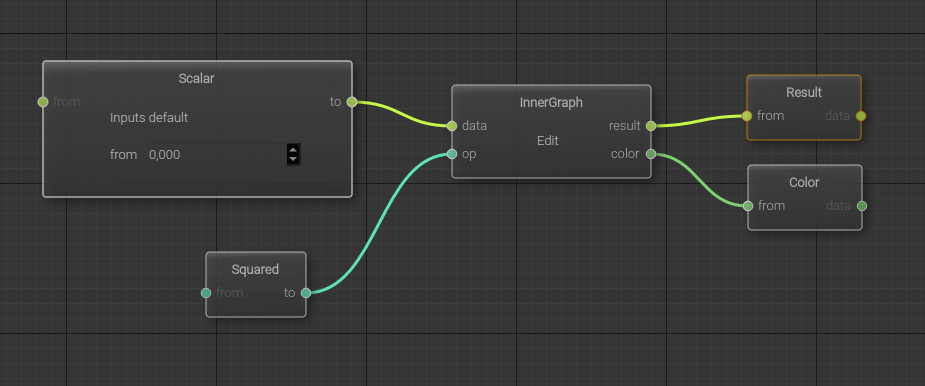 A graph can use another graph as node. The inner graph must have input/output nodes to expose input/output ports. Related methods :