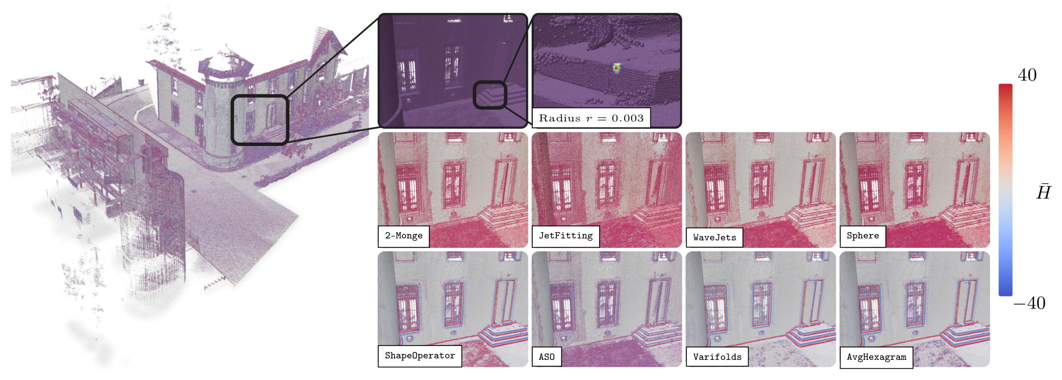 A lot of related works has been proposed to locally estimate such quantities, as illustrated here with a visual comparison of mean curvature (H) estimators (values are clamped to the [-40,40], unsigned/signed curvature values for the top/bottom row respectively).
